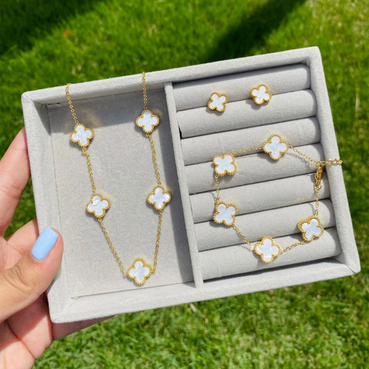 Set Van Cleef: Collar 5 Tréboles + Pulsera + Aretes, Todo Bañado en Oro + Caja Regalo